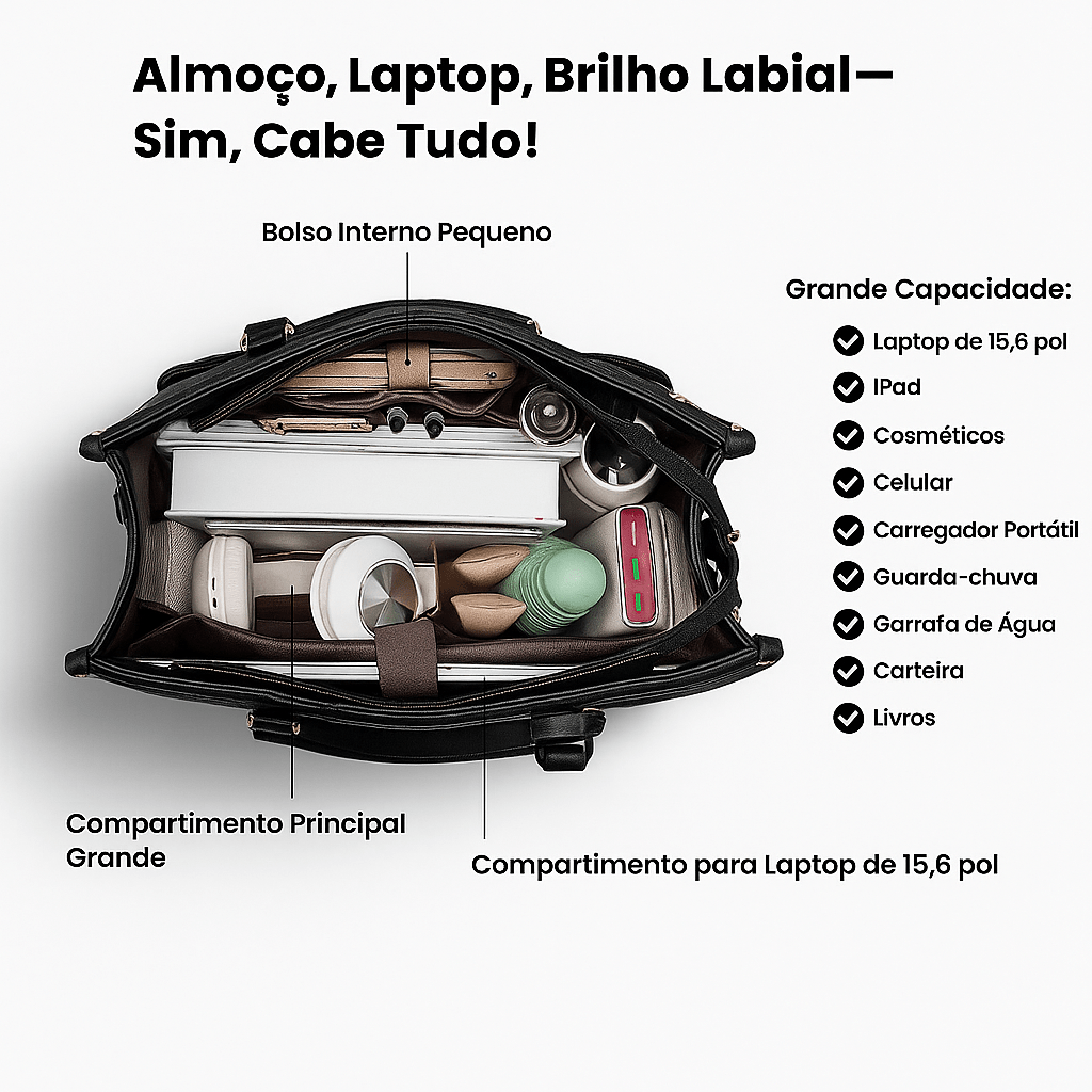 Elegante e funcional, esta bolsa 3 em 1 possui um compartimento para laptop de 15,6", uma seção isolada para almoço e uma bolsa espaçosa — tudo em um design elegante. Ideal para o trabalho, viagens ou uso diário, ela mantém você organizado sem esforço.