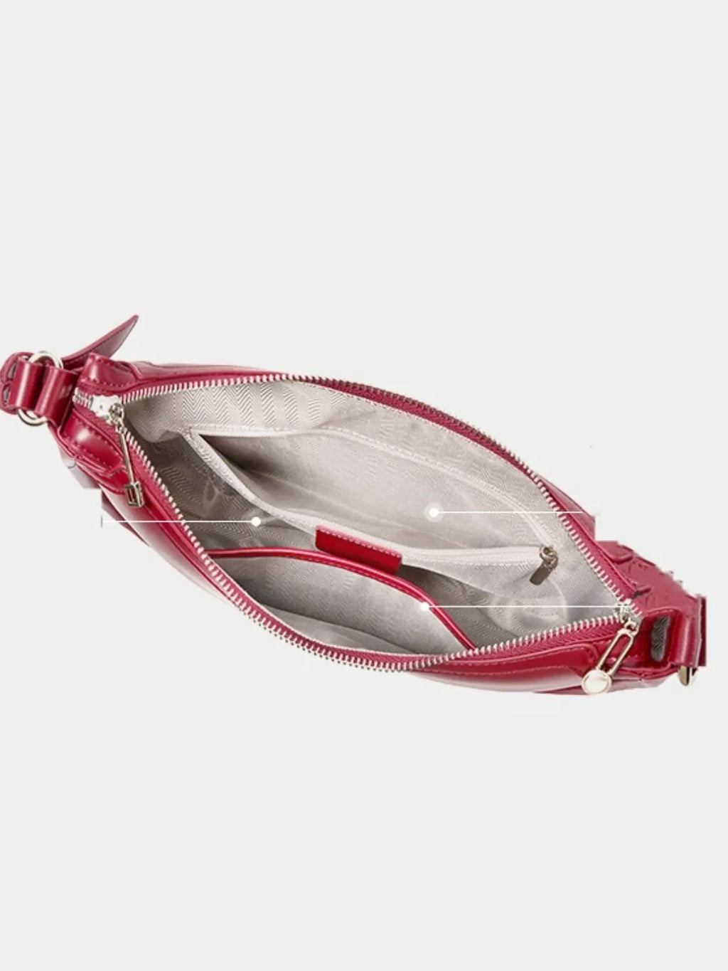 • Detalhes: Formato meia lua, alça ajustável, fechamento superior com zíper.